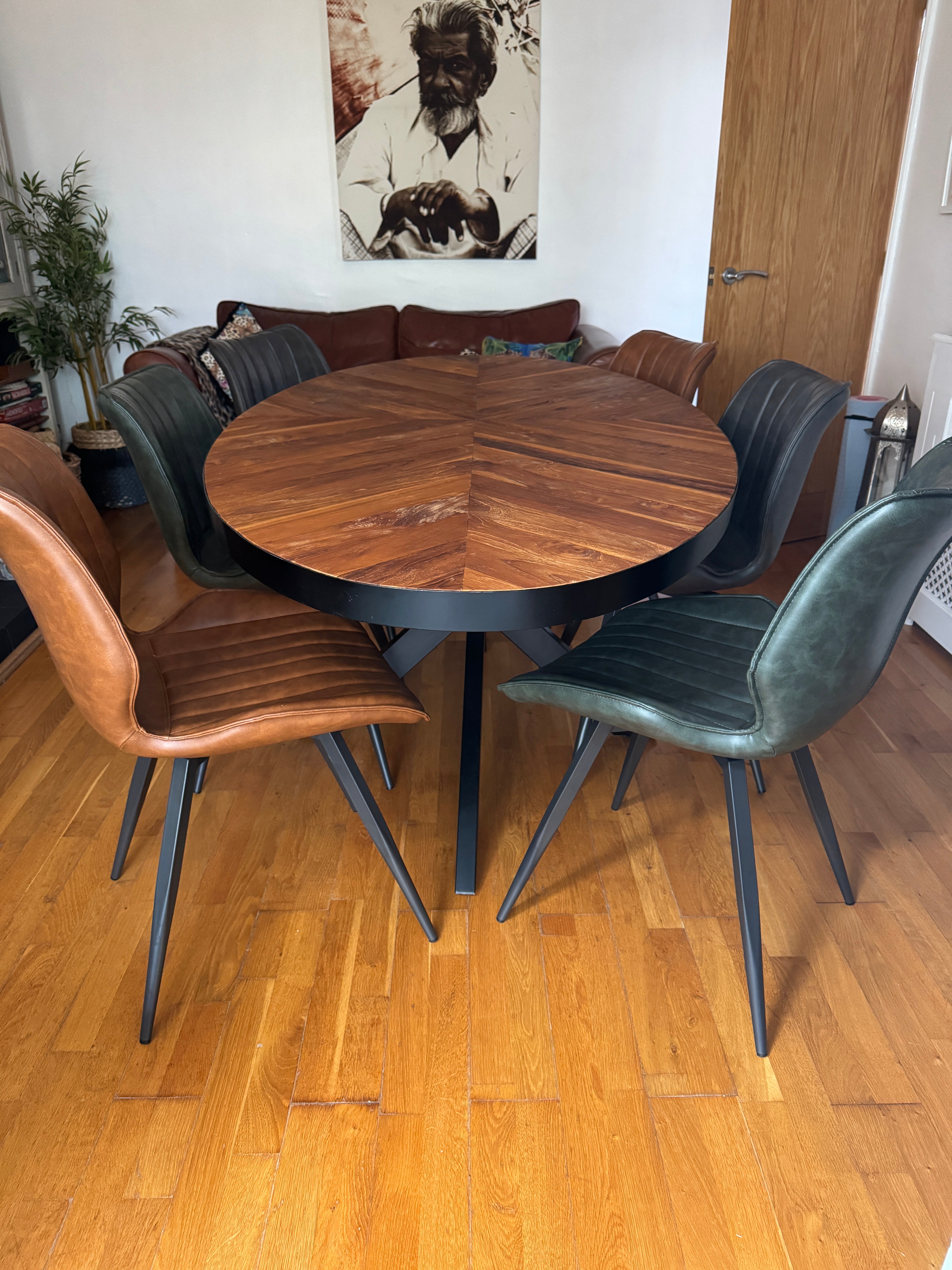 Oban oval dining table with herringbone finish and Alfa bounce dining chairs in alternate colours (green, tan and grey) - table top has been finished with a shellac oil to protect the wood
