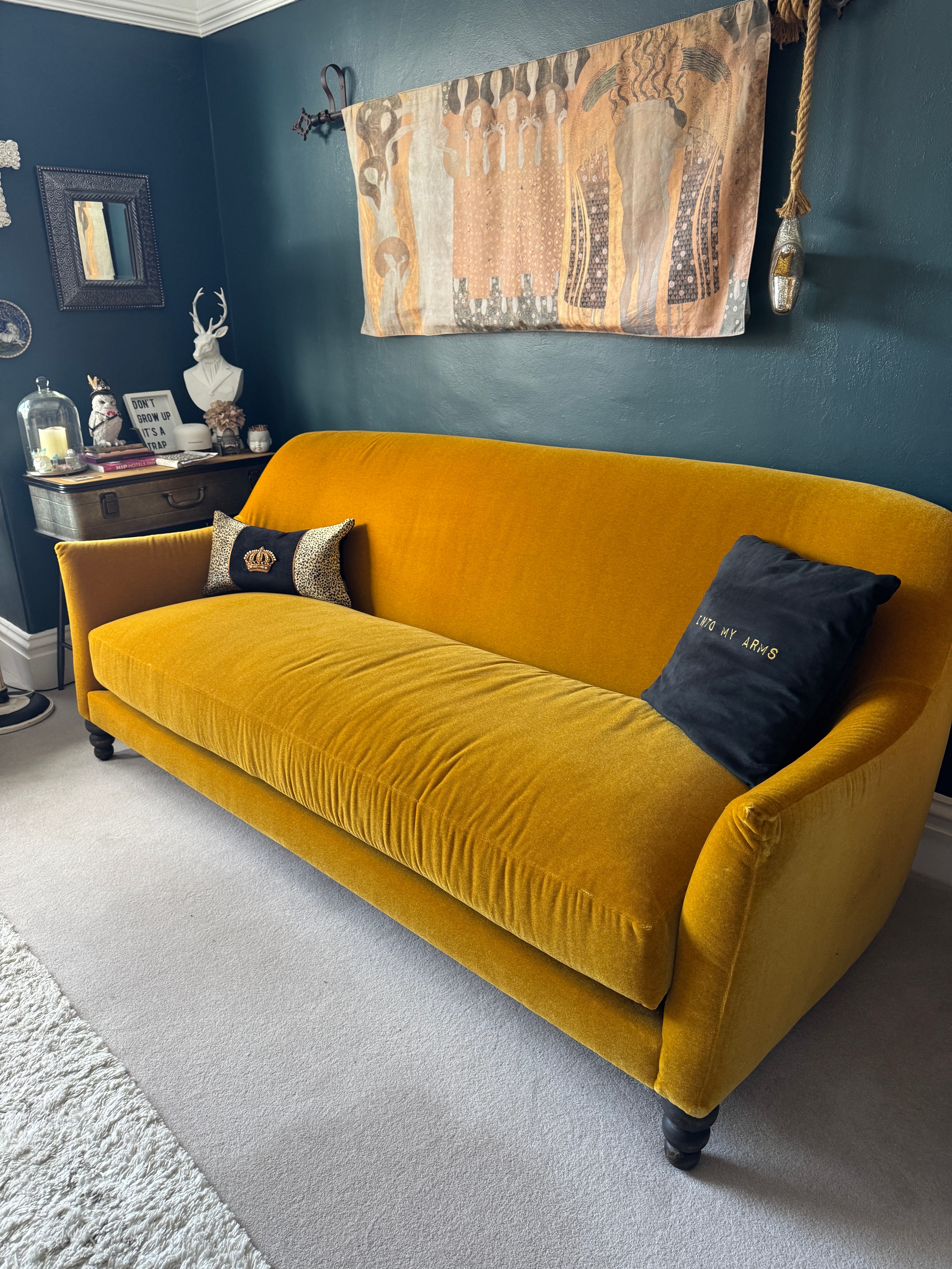 Bloombury large 4 seater bench style sofa in mustard mohair velvet fabric - the rich mustard colour contrasts beautifully with the moody blue walls
