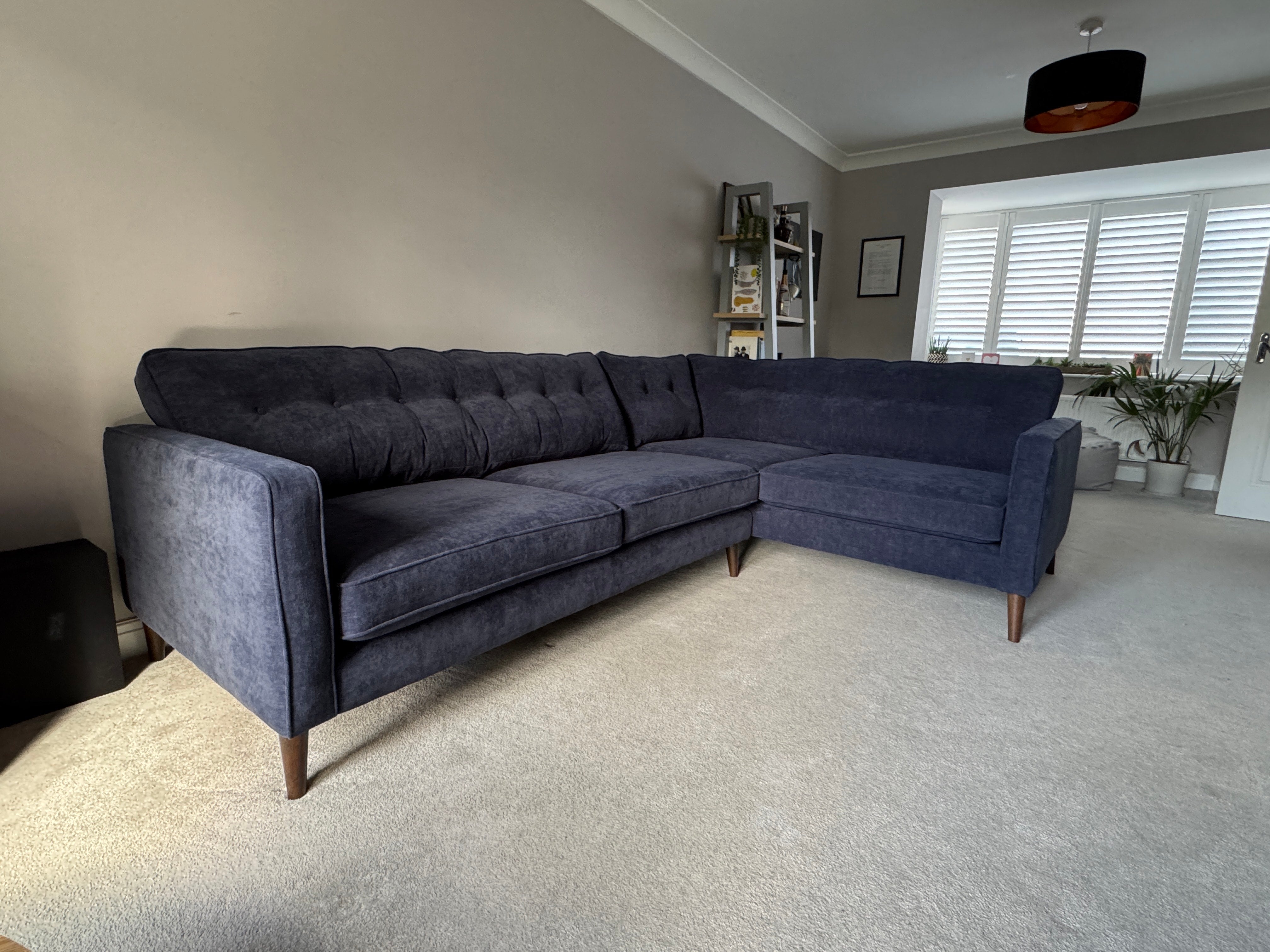 Orla Kiely Ebben corner sofa in rich navy fabric - by positioning the sofa away from the corner, it made a large room feel more cosy.